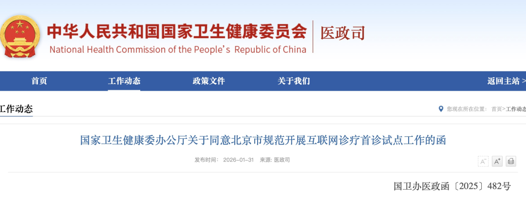 1月31日,国家卫生健康委发布《关于同意北京市规范开展互联网诊疗首诊试点工作的函》,为充分利用信息技术疏解北京非首都功能,满足外地患者就医需求、方便就医