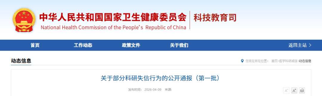 国家卫生健康委关于部分科研失信行为的公开通报(第一批)