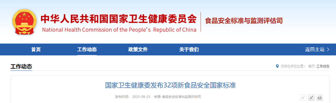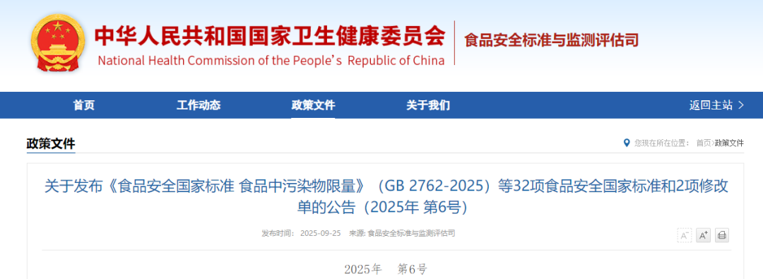 根据《中华人民共和国食品安全法》规定,经食品安全国家标准审评委员会审查通过,现发布《食品安全国家标准 食品中污染物限量》(GB 2762-2025)等32项食品安全国家标准和2项修改单。其编号和名称如下: