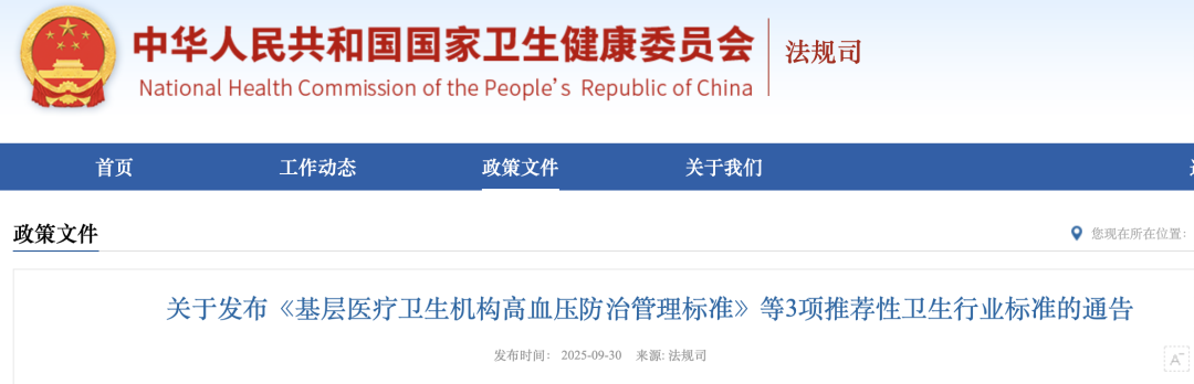 关于发布《基层医疗卫生机构高血压防治管理标准》等3项推荐性卫生行业标准的通告